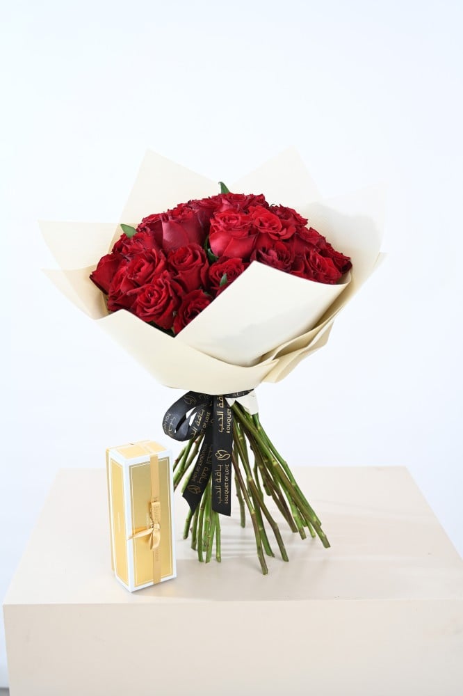 - تتميز هذه الباقة بورود الجوري الحمراء الفاخرة التي تعبر عن الحب والعاطفة بشكل لا مثيل له.